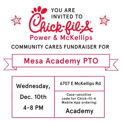 Cow-approved fundraising: Eat more chicken, help more kids! Show your flyer when you order, or use code Academy in the "Support Community Care Event" space when ordering online. and 15% of your purchase gets donated back to the PTO.