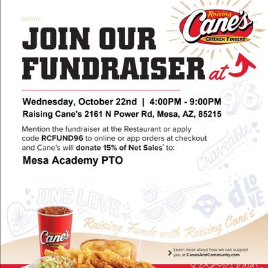 Raising Cane's and raising funds! This eating for education is a delicious way to support your school. Bring your flyer or use code RCFUNDS96 when ordering online and 15% of your purchase gets donated back to the school.