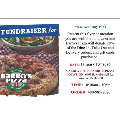 Let’s raise some dough the Barro’s way! Show your flyer when you place or pick-up order and 20% of your purchase gets donated back to the PTO.